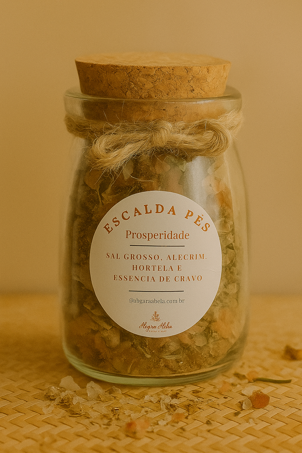 Modo de uso: Adicione o conteúdo do vidro em uma bacia com água morna. Mergulhe os pés por 15 a 20 minutos.Inspire fundo, relaxe e permita-se sentir o poder das ervas e do sal. Produto artesanal e vegano, 100% natural, sem corantes nem conservantes, Frasco de vidro reutilizável. Complemente com sua vela Abgara favorita — o ambiente se ilumina e a energia se renova.