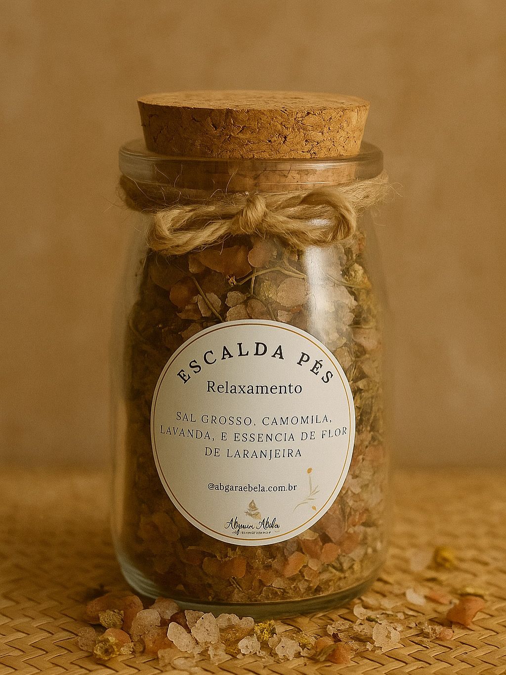 Modo de uso: Adicione o conteúdo do vidro em uma bacia com água morna. Mergulhe os pés por 15 a 20 minutos.Inspire fundo, relaxe e permita-se sentir o poder das ervas e do sal. Produto artesanal e vegano, 100% natural, sem corantes nem conservantes, Frasco de vidro reutilizável. Complemente com sua vela Abgara favorita — o ambiente se ilumina e a energia se renova.